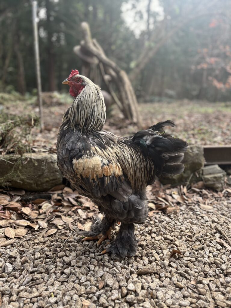 昨年の春、うちの仲間入りをしたひよこが今年の春には立派なボスになりました。名前は「フイゴ」といいます。ブラマという品種で大型の鶏、性格は優しく、人に懐く。ということでした。フイゴは体がとにかく大きく、常に周りを警戒しています。女子には優しく、餌を独り占めするようなことはありません。おやつを与えても、自分では食べずに必ず女子に与えます。残念ながら人には懐いていません。フサフサに顔を埋めたいのですが、それは許されないのです。その昔、若冲という絵師がいたそうです。鶏をモチーフとして描いていました。彼の絵を見ると鶏と作者の距離が感じられます。すぐ手の届くところに鶏がいたんだとわかります。そんな作品を作ることができたらいいなと日々感じています。